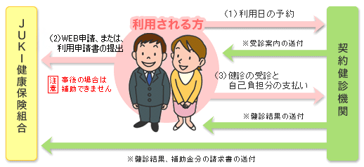 - 注1)利用日、受診内容等の変更および、キャンセルが生じた場合、受診される方が直接、契約健診機関に連絡後、すみやかに、JUKI健康保険組合に連絡をしてください。